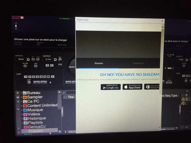 oui... sauf que j'ai pas réussi à me connecter à mon compte Shazam....et la quand je fait sign in dans VDJ....j'ai un screen qui apparait ''OH no you have no shazam'' qui flash à répétition non stop......j'ai fermer VDJ....reboote l'ordi...mais même chose....grrrr......tu à une idée?....merci