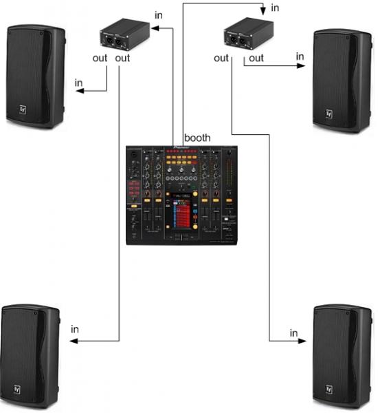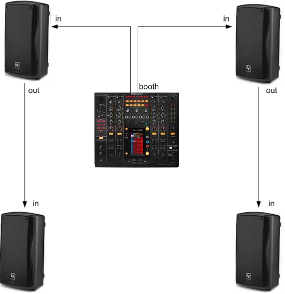 Je sortirais sur la sortie "booth" de la console pour entrer dans les deux premières enceintes de monitoring puis de celles ci, je repartirais vers les deux suivantes tout simplement.