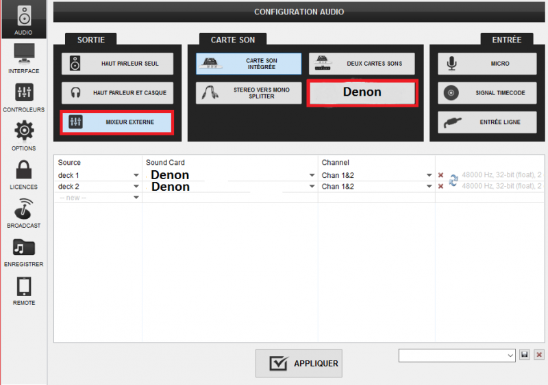 Dans la rubrique audio dans external mixer j ai bien dans sound card denon dj