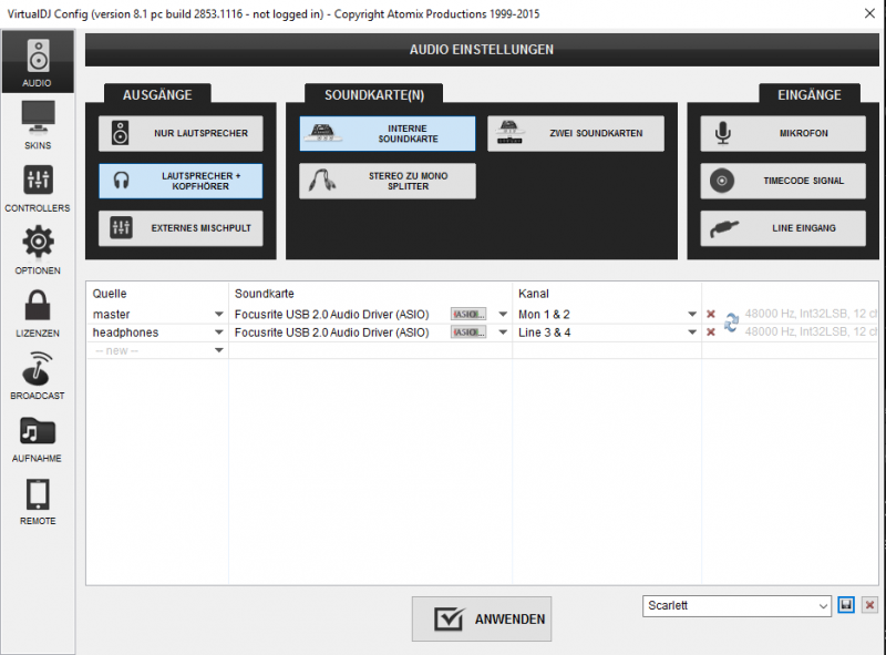 Ich habe das Audiointerface Foucsrite Scarell 6i6. Mit u.a. 2 Outputs.Über ein den ersten Output "Monitor" kommt ja das komplette Signal von beiden Decks. Nun möchte ich auf den 2 Output mein Kopfhörer legen, damit ich Lieder vorhören kann. Doch irgendwie schaffe ich es nicht.