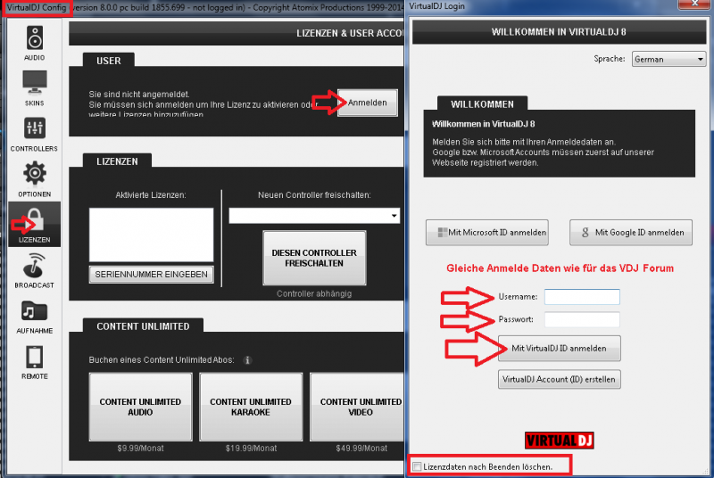 Downloade diese Version VIRTUALDJ 8, installierst, danach loggst dich mit den gleichen Daten ein wie im Forum unter Config/ Lizenzen.