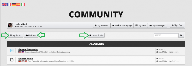 Wer zu oberst im Forum ist http://de.virtualdj.com/forums/index.html geht, erkennt 3 neue Buttons mit [ My Topics ] [ My Posts ] [ Latest Posts ]