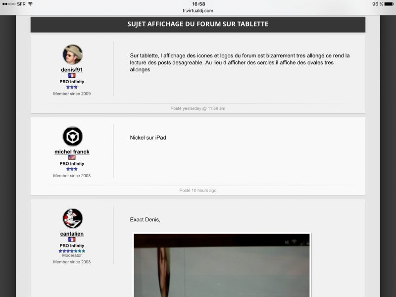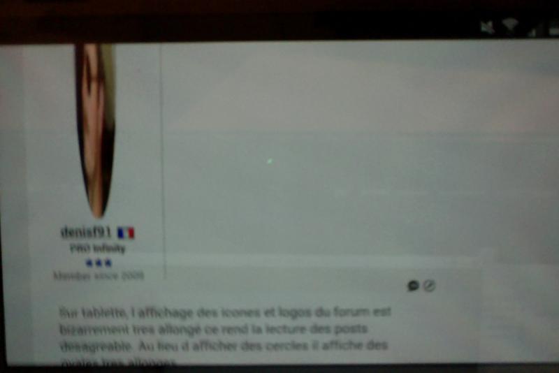 Sur tablette, l affichage des icones et logos du forum est bizarrement tres allongé ce rend la lecture des posts desagreable. Au lieu d afficher des cercles il affiche des ovales tres allonges
