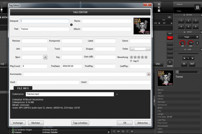 Mach den Mal mit dem VirtualDJ Tag Editor auf, Rechtsclick auf dem Song. Was Windows Explorer anzeigt will ich nicht wissen !