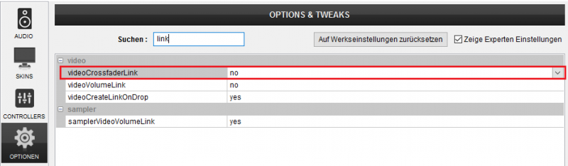 oder in den Optionen videoCrossfaderLink auf yes stellen !