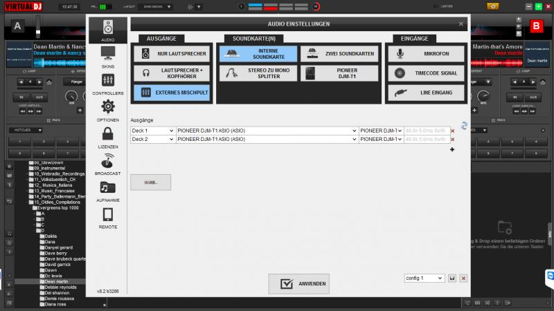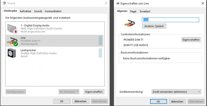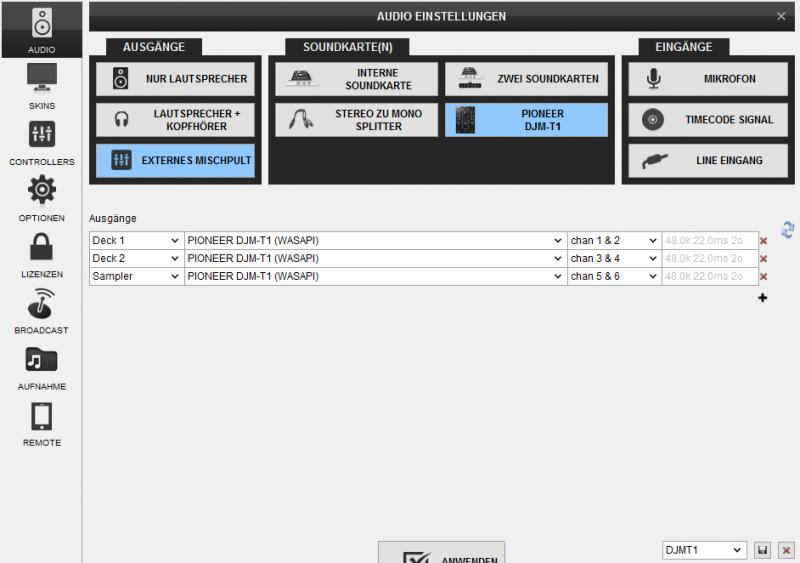 hab dann mal diesen ASIO Treiber gewählt in der Config anstatt den WASAPI und Deck 1 auf DJMT1 1/2 und Deck b auf 3/4 genommen, jetzt scheint es zu laufen aber ich denke das ist so nicht korrekt oder? ich habe noch ein screenshot dazugelegt wie es jetzt eingestellt ist und läuft. Den Amp habe ich natürlich am Pioneer Cinch Out angehängt...