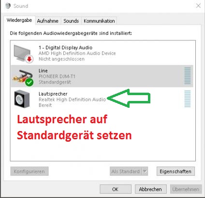 Stelle bitte in der Soundconfig von Windows bei Wiedergabe die Lautsprecher als Standartgeräte ein und nicht dein Pioneer Mixer.
