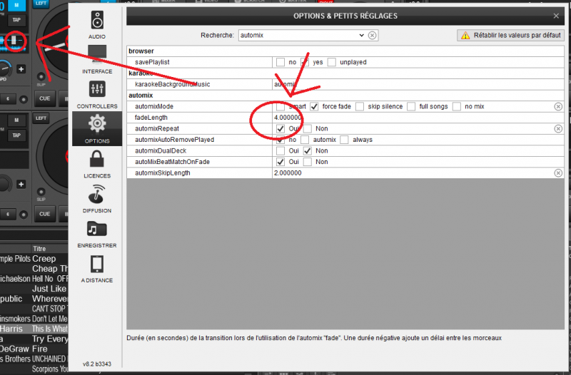Voila,Je viens de passer de VDj5 à VDJ8 et je ne peux pas régler la durée de l'automix (qui est de 2 sec d'origine). Je suis allé dans les "Options:Tous paramétrages...." et ,la , j'ai changé "Fadelenght etc..." mais la durée ne change pas.