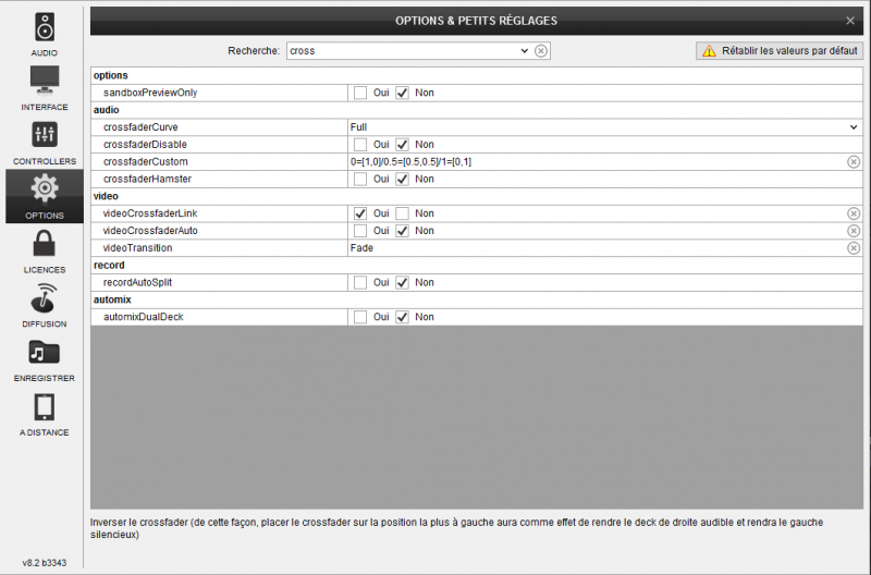 Chaque fois que j'ouvre VirtualDJ, je dois aller dans les paramètres pour décocher Crossfader Hamster... Mon crossfader est toujours inversé. Il m'est même arrivé quelques fois qu'il se remet en mode inversé durant une session.