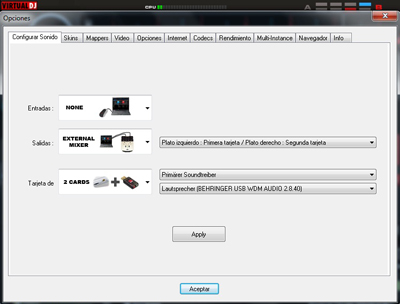 Quedando asi linea 1 con la tarjeta BEHRINGER UCA 202 y linea 2 con la tarjeta de la laptop (AUDIFONOS) y respectivamente al mezclador sound pro, no observo muy bien como se hace esta configuracion,algo q me diga donde puedo separar las tarjetas para deck a y deck b,mi inquietud no es hacer esta operacion para hacer la preescucha como lo quieren mucho,mi intencion es separar los deck a y deck b del virtual dj,y asi utilizarlos como cds players,de antemano doy las gracias al q me pueda orientar,y disculpen tanta habladuria para explicar una cosa pero quiero q quede claro mi intension,de todas formas dejare un link de un video de youtube,donde una persona explica mediante un esquema bien dibujado exactamente lo que deseo,pero a diferencia que el aconseja otro mezclador virtual,pero en ningun momento da imagenes de como se configura el mezclador virtual,aca esta el link: