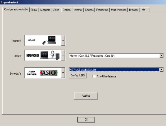 lasciare gli ingressi in NONE, le uscite in HEADPHONE, e scegliere le schede in ASIO DRIVER.