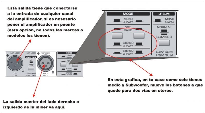 Por decir, en un canal esta conectado en high (A) en el otro esta conectado en high y el sub en low (B) Modo 2 way. Espero estar claro en mis explicaciones