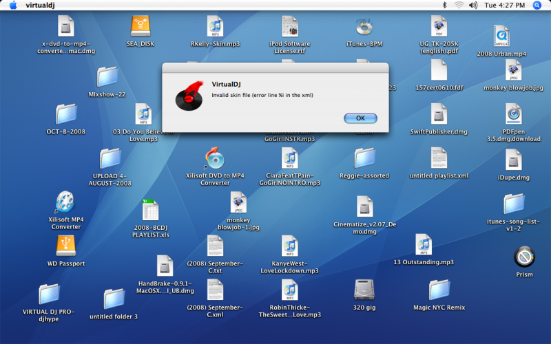 Mine is doing the same exact thing. Didn't at first but I recently bought the "new" MacBook and when I do a clean install and attempt to run the dmz file VirtualDJ gives me the "error line %i in xml." Even if I completely delete the skins folder and do another install it won't work.